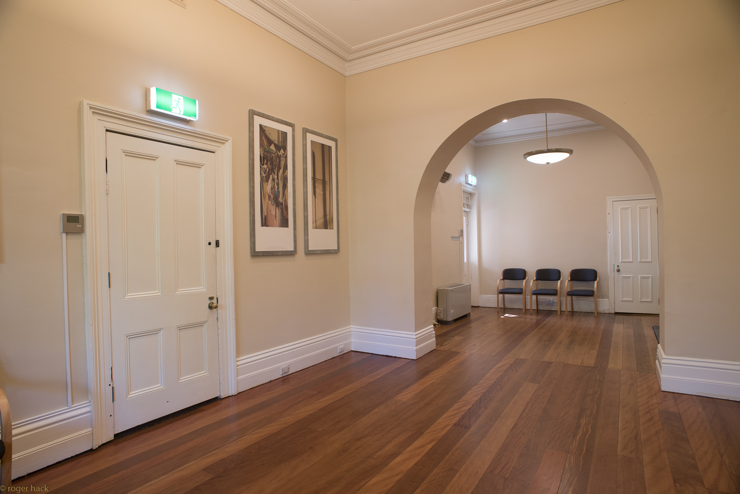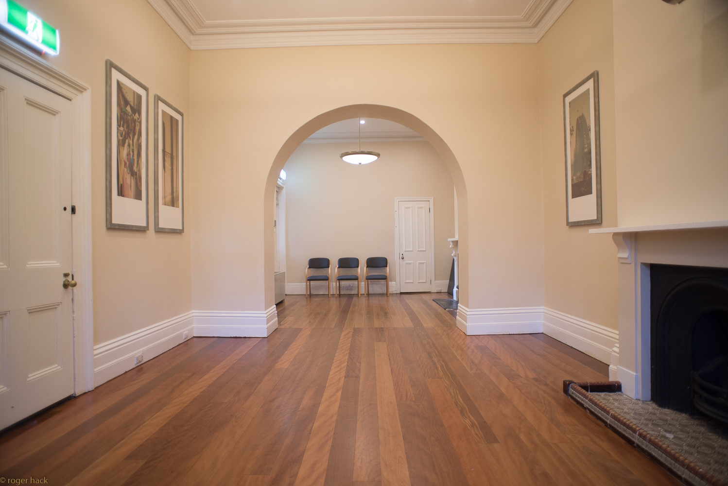 The Trelawney room has high ceilings and a timber floor and features original fireplaces. The Trelawney room has a graceful arch midway and a large front window opening onto the front verandah. The rear side door opens into the back courtyard by the old frangipani tree. This room has multiple uses, and furniture can be removed if you want a blank canvas.